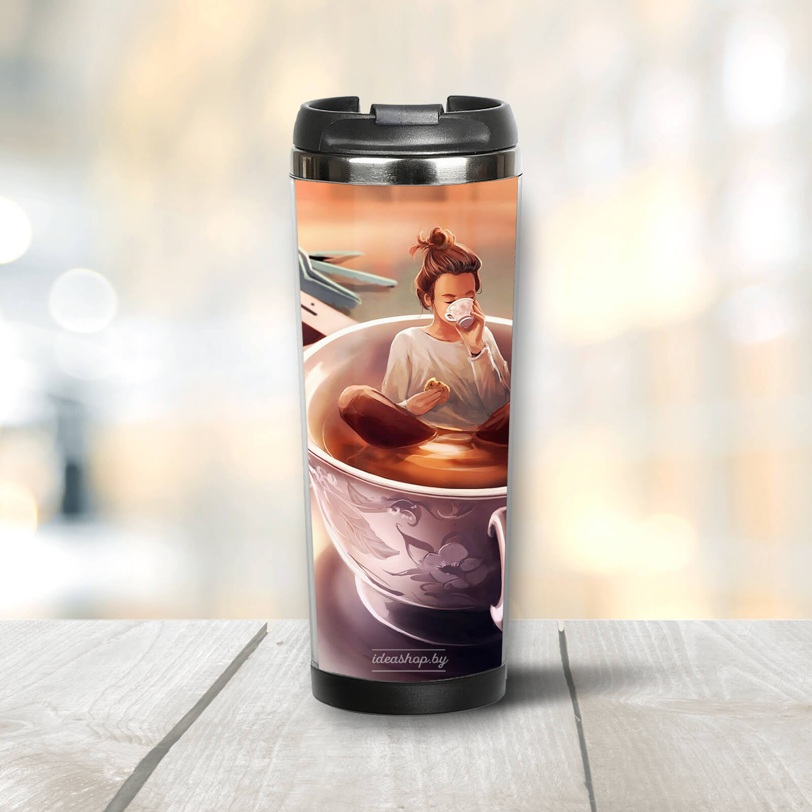 Термокружка "Девушка с кофе" станет оригинальным и практичным подарком.